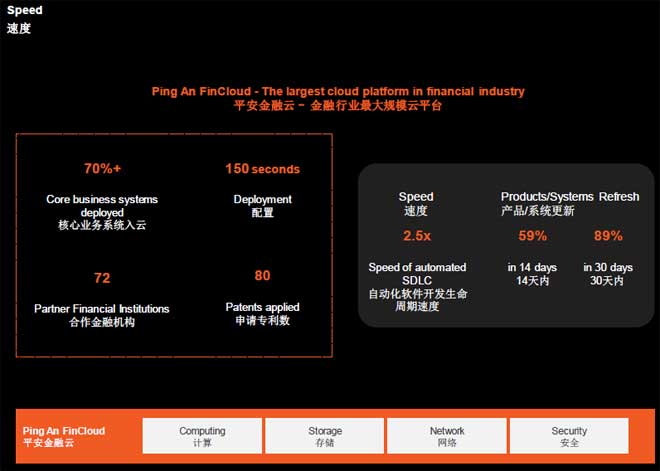 速度对于市场和客户服务都是很重要的,平安通过建立金融云平台来实现。目前已经有70%的核心业务接入了金融云,是中国金融业中比例最大的。