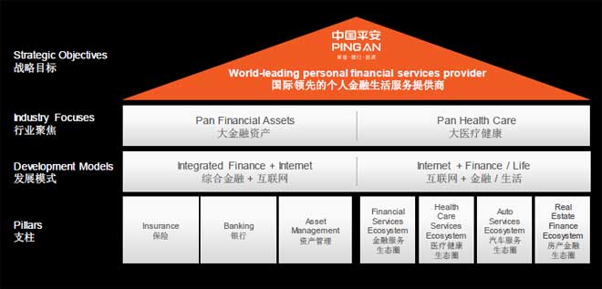 平安战略–“一个定位、两个聚焦、四个生态服务”。平安的战略目标是成为国际领先的个人金融生活服务提供商。
