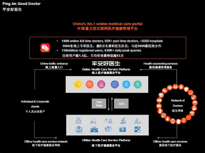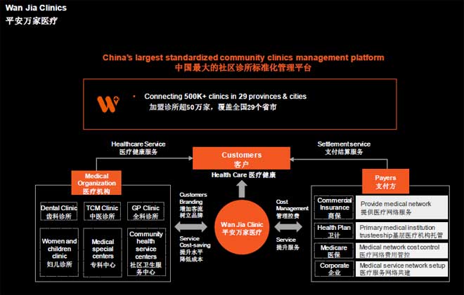 而线下,平安有‘万家诊所’,致力于为诊所创造基础的标准,比如如何管理患者,如何达到医保标准,目前平台上有2万家诊所,希望能在医疗产业产巨大的影响并通过这样的业务和平台拿到医保全国数据,以及电子病历。