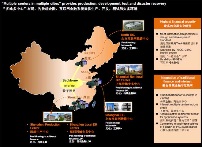 平安发展作为基础设施云平台,可以运用在各个地方。如,北方互联网数据中心:定位,互联网+。上海异地灾备中心:传统金融DR。上海互联网数据中心:互联网+。