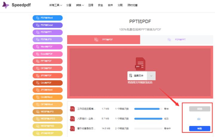 再进行转换即可,我们可以选择在线免费转换的方法,既不用另外安装软件,手机也能直接转。搜索speedpdf打开工具选择PPT转PDF进入转换,添加需要转换的PPT文档后,点击转换即可,这种转换都比较简单,等待一会转换完成直接下载即可。