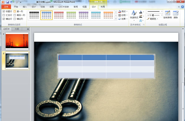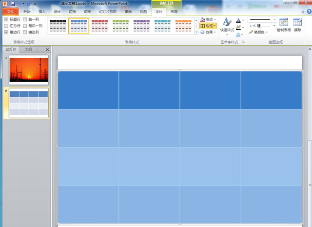 第三步,让“四行四列”的表格与图片大小对齐;调整表格线条:点击菜单栏中“设计”中的“边框”,让其各个线条粗细一致(此时表格覆盖着图片的)。