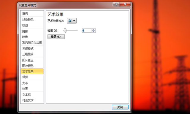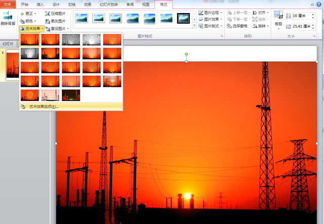 第一步,我们导入一张图片(这里我导入一张电厂的图片),点击菜单栏中“格式”选择“艺术效果选项”。