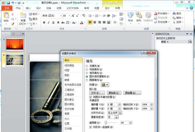 第五步,剪切(快捷键Ctrl+X)图片—>打开表格中“小眼睛”使其出现—>全选表格右击鼠标选择“设置形状格式”—>填充选择“图片或纹理填充”中的“剪贴板”(同时打勾选项):