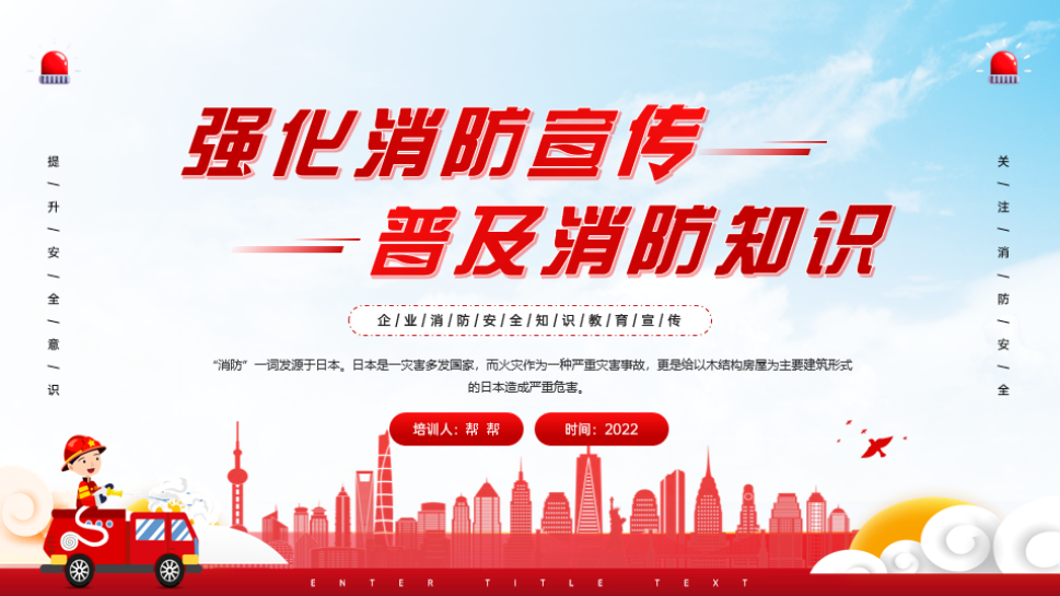 2.今天跟大家分享一张强化消防宣传,普及消防知识讲座PPT模板,全内容直接F5演示。