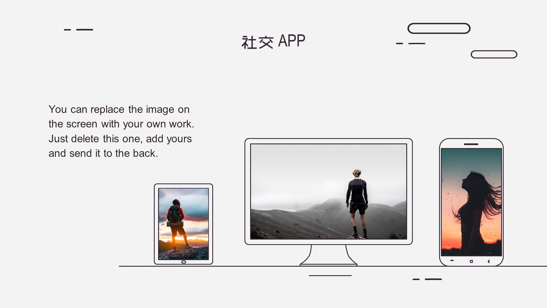 PPT如果使用熟练,可以使用线条、矩形、菱形、任意多边形等绘制手机、平板、PC等简单场景的样机,如: