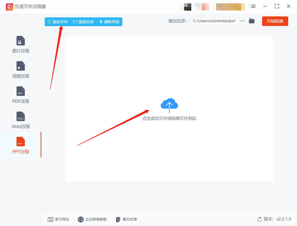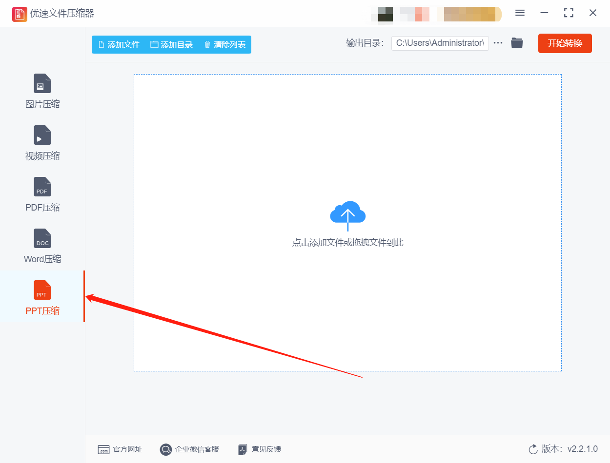 点击【添加文件】按钮,选择需要压缩的PPT文件上传到软件工具里,也可用鼠标直接将其拖拽到软件里,软件支持批量上传,进行批量压缩。