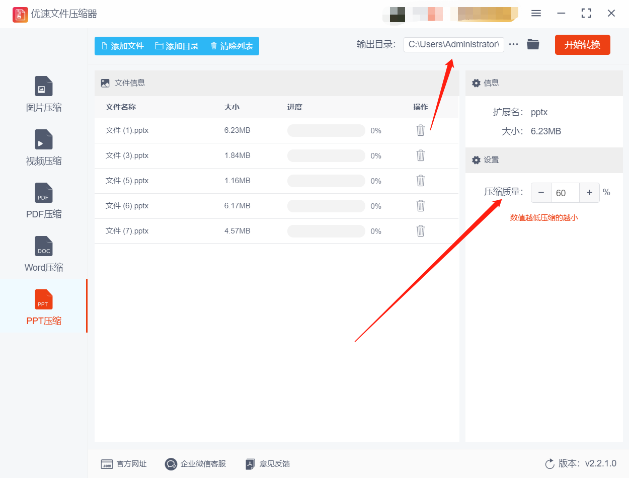 我们在软件右侧设置质量压缩值,如图所示,质量压缩值设置的低,那么被压缩后的PPT文件也相应的小,想要将PPT压缩的最小,需要我们将质量压缩值设置到最低。质量压缩值设置完成后,在软件右上方设置输出目录文件夹,用来保存压缩好的PPT文件。