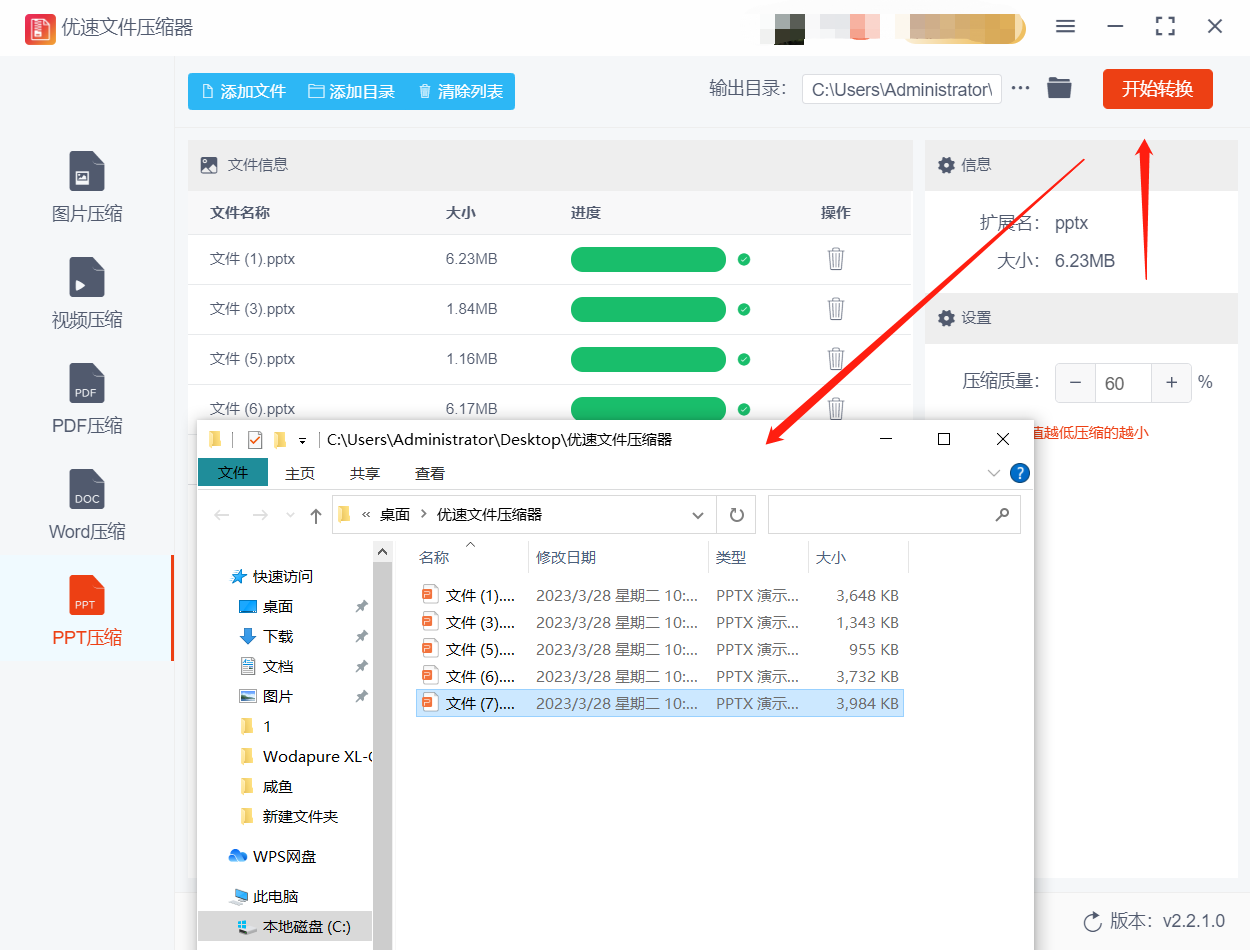 设置完成后,点击【开始转换】按钮,启动软件的压缩PPT程序,当用户看到系统自动弹出打开输出文件夹时,压缩完成。
