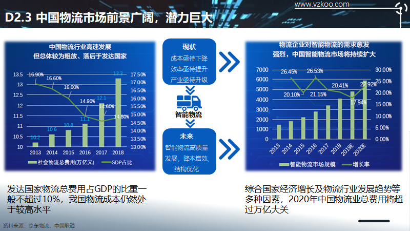 随着我们物流能力的提升,物流市场规模持续扩大,社会物流总费用占GDP比率已高达14.8%,远远高于欧美发达国家10%以下的水平,说明我国是物流大国,但绝不是物流强国,依然存在很大的优化空间。