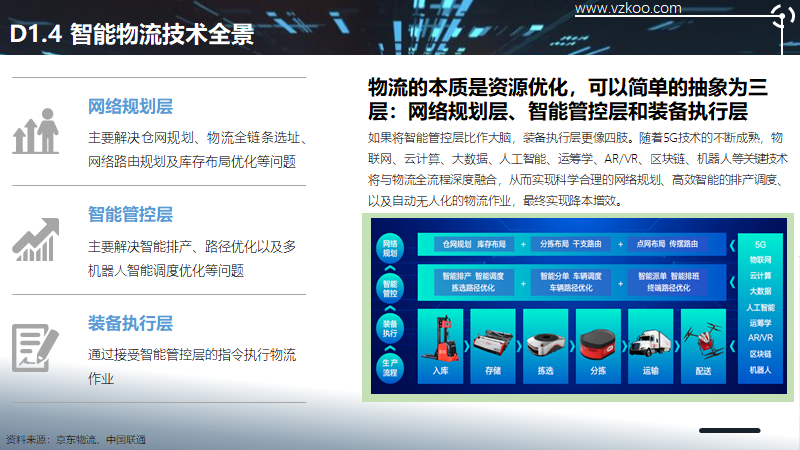 智能物流技术全景:物流的本质是资源优化,可以简单的抽象为三层:网络规划层、智能管控层和装备执行层