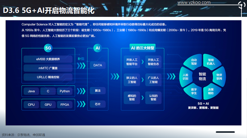 如果将智能管控层比作大脑,装备执行层更像四肢。随着5G技术的不断成熟,物联网、云计算、大数据、人工智能、运筹学、AR/VR、区块链、机器人等关键技术将与物流全流程深度融合,从而实现科学合理的网络规划、高效智能的排产调度、以及自动无人化的物流作业,最终实现降本增效。