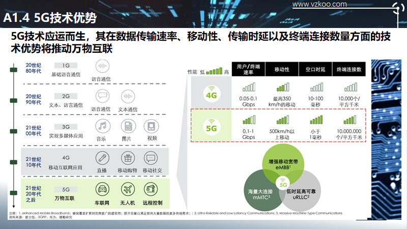 5G技术应运而生,其在数据传输速率、移动性、传输时延以及终端连接数量方面的技术优势将推动万物互联