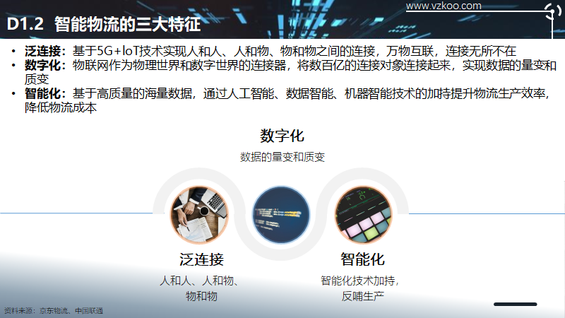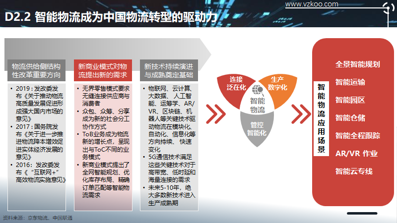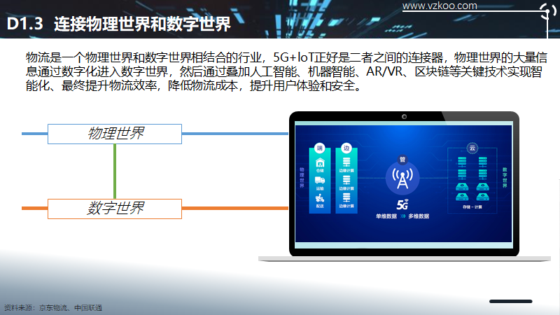 物流是一个物理世界和数字世界相结合的行业,5G+loT正好是二者之间的连接器,物理世界的大量信息通过数字化进入数字世界,然后通过叠加人工智能、机器智能、AR/VR、区块链等关键技术实现智能化、最终提升物流效率,降低物流成本,提升用户体验和安全。