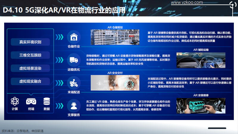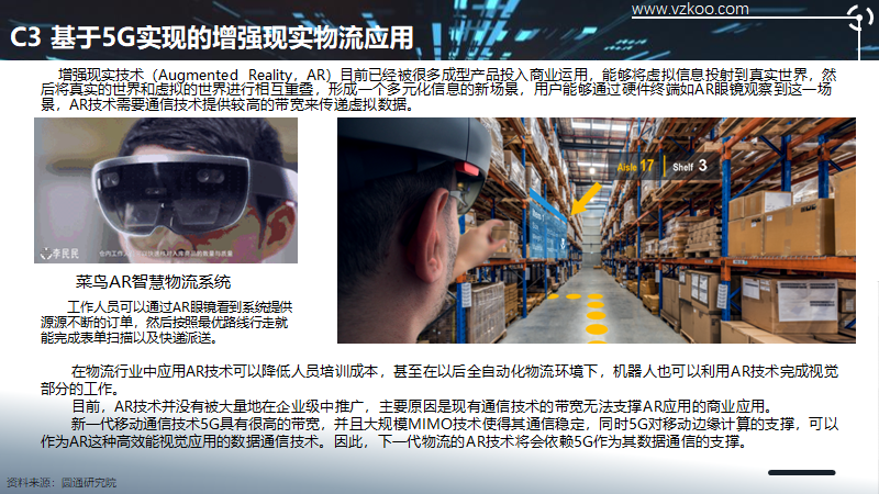 新一代移动通信技术5G具有很高的带宽,并且大规模MIMO技术使得其通信稳定,同时5G对移动边缘计算的支撑,可以作为AR这种高效能视觉应用的数据通信技术。因此,下一代物流的AR技术将会依赖5G作为其数据通信的支撑。