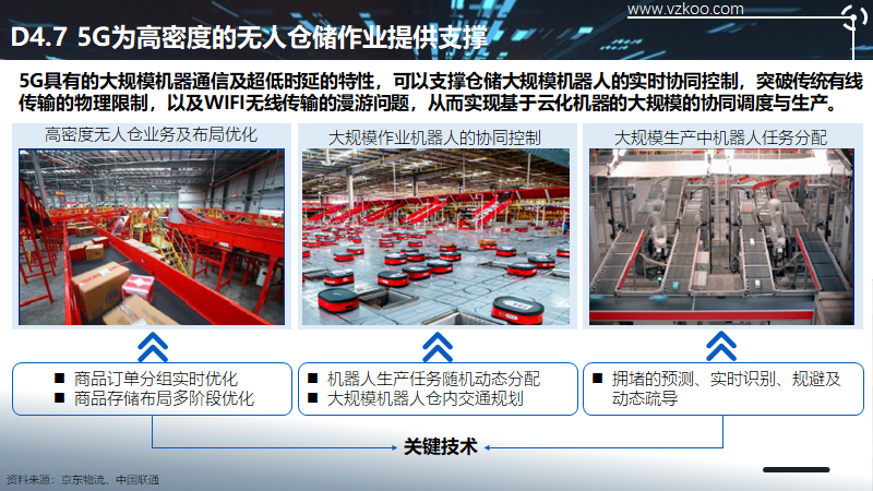 5G具有的大规模机器通信及超低时延的特性,可以支撑仓储大规模机器人的实时协同控制,突破传统有线传输的物理限制,以及WIFI无线传输的漫游问题,从而实现基于云化机器的大规模的协同调度与生产。