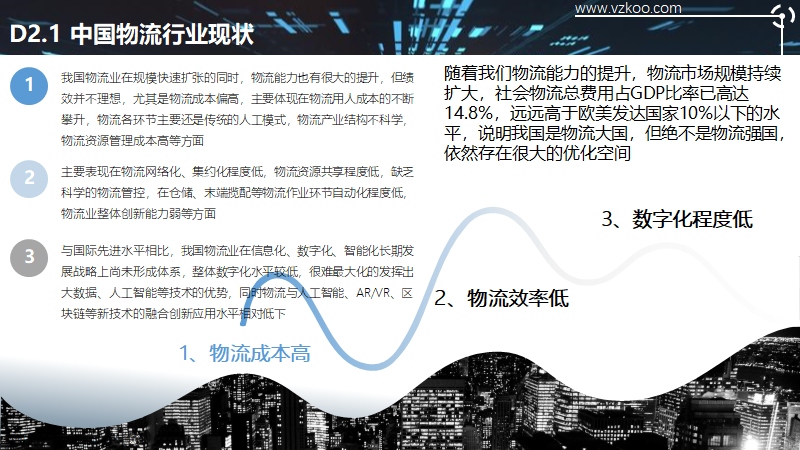 二、物流效率低。主要表现在物流网络化、集约化程度低,物流资源共享程度低,缺乏科学的物流管控,在仓储、末端揽配等物流作业环节自动化程度低,物流业整体创新能力弱等方面。
