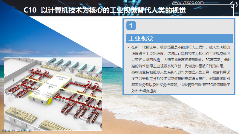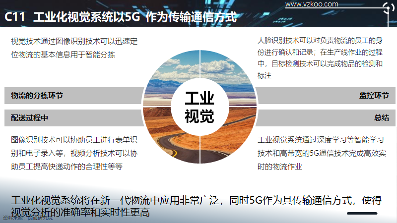 在新一代物流中,很多场景是不能进行人工操作,或人类肉眼的速度跟不上流水速度,这时以计算机技术为核心的工业视觉就可以替代人类的视觉,大幅度地提高物流自动化。5G高带宽、低时延的特性使得工业视觉系统在新一代物流中更被广泛的应用,一些物流监控和视觉采集系统可以作为数据采集工具,然后利用深度学习等视觉分析技术完成数据的高层语义操作,例如图像识别和实例分割以及语义分析等等,这些复杂的操作在5G通信辅助下,效率大幅度提高。
