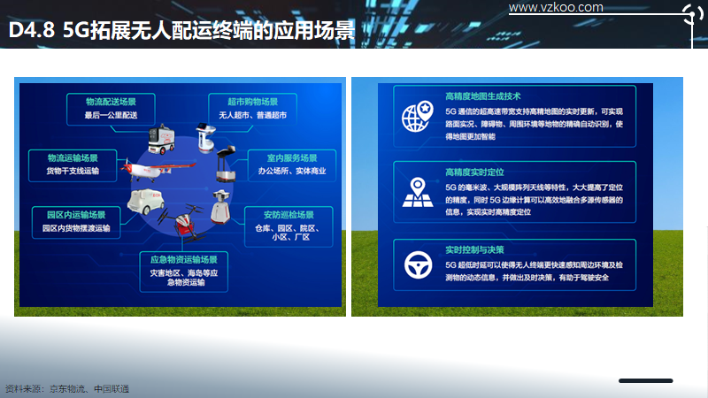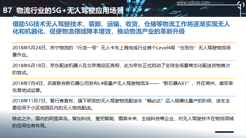 5G使无人驾驶物流成为可能:无人驾驶技术是5G 应用场景中最难实现的子场景。 5G是无人驾驶技术的奠基石,能够有效促进无人驾驶技术的应用,也能够促进新一代物流行业中全自动化运输产业的发展。5G间接地积极影响上游企业的运转,能够让用户更有信心使用电子网购,从而完善整个物流供应链体系。