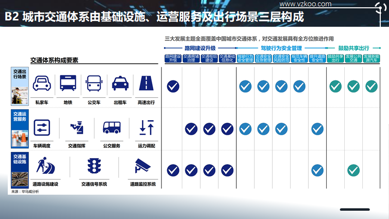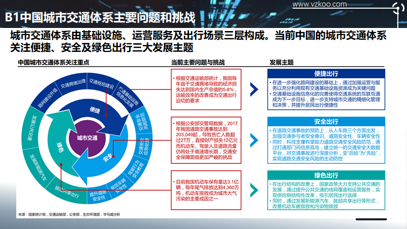 城市交通体系由基础设施、运营服务及出行场景三层构成。当前中国的城市交通体系关注便捷、安全及绿色出行三大发展主题