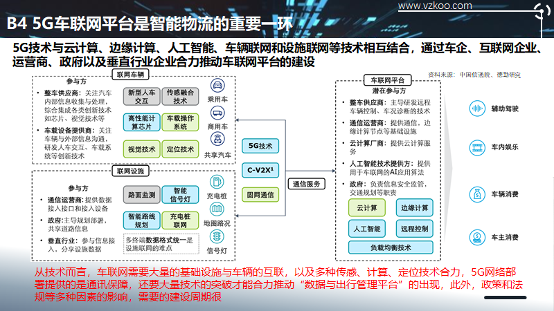 5G技术与云计算、边缘计算、人工智能、车辆联网和设施联网等技术相互结合,通过车企、互联网企业、运营商、政府以及垂直行业企业合力推动车联网平台的建设