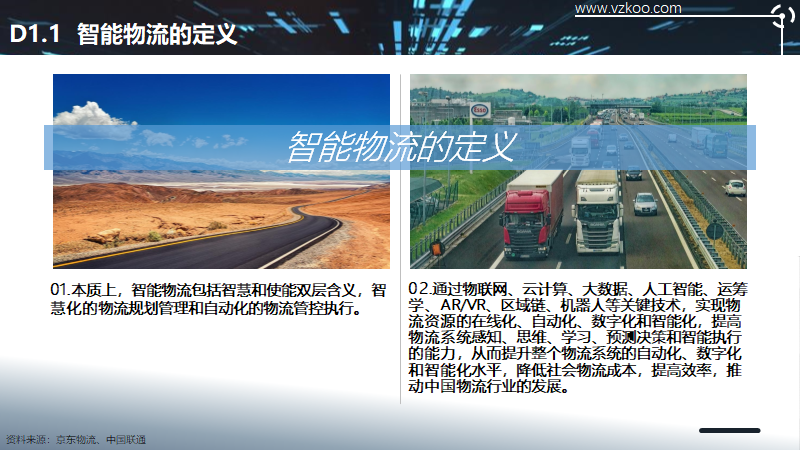智能物流的定义:本质上,智能物流包括智慧和使能双层含义,智慧化的物流规划管理和自动化的物流管控执行。通过物联网、云计算、大数据、人工智能、运筹学、AR/VR、区域链、机器人等关键技术,实现物流资源的在线化、自动化、数字化和智能化,提高物流系统感知、思维、学习、预测决策和智能执行的能力,从而提升整个物流系统的自动化、数字化和智能化水平,降低社会物流成本,提高效率,推动中国物流行业的发展。
