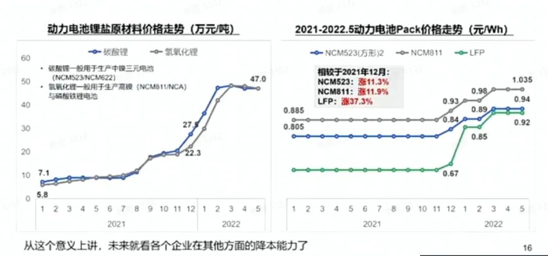 相比于2021年,动力电池锂盐原材料的价格基本上已经翻倍,导致动力电池包的价格大幅上涨,特别是磷酸铁锂电池,已经接近每度电千元。