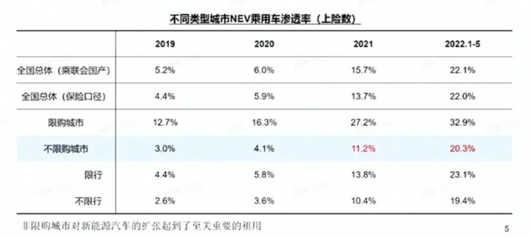 特别地,新能源汽车在不限行且不限购的城市,渗透率已经从21年的10.4%,提升到了19.4%(22年1-5月),同比增长了100%。