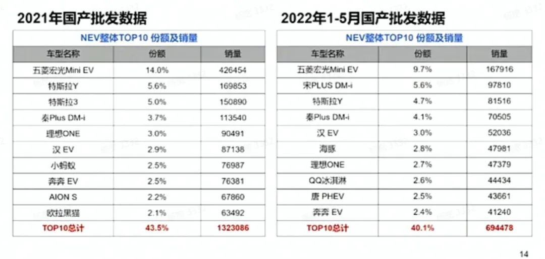 22年1-5月,新能源汽车的热销车型包括了特斯拉Model Y(C级SUV)、宏光MINI EV(A00轿车)、比亚迪秦Plus DM-i(A级轿车)、比亚迪宋Plus DM-i(B级SUV)。