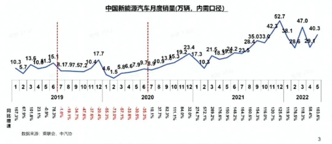 通过研究新能源汽车月度销量走势,从2020年7月份的拐点开始,其间经历了2021年疫情、2022年疫情、上游原材料上涨、还有缺芯的冲击,出现了上下的波动和起伏。