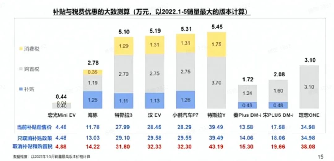 进一步拆分性价比,更多地体现在了当前的政策上,即税费(消费税+购置税)的减免和新能源汽车补贴。