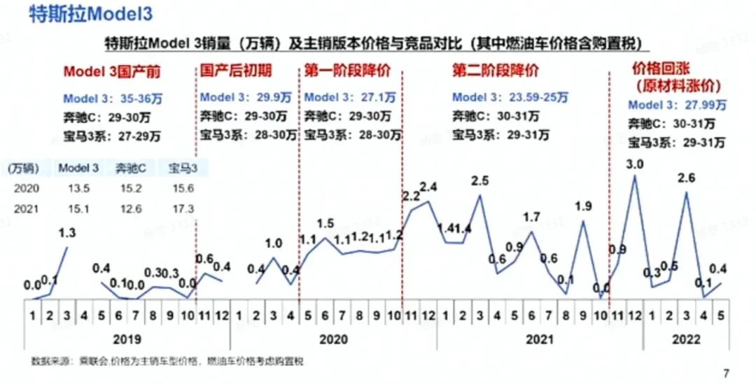 以特斯拉Model 3为例,Model 3从2019年上市至今,通过国产化经历了两轮降价和一轮价格回涨,而其竞品价格相对保持稳定。