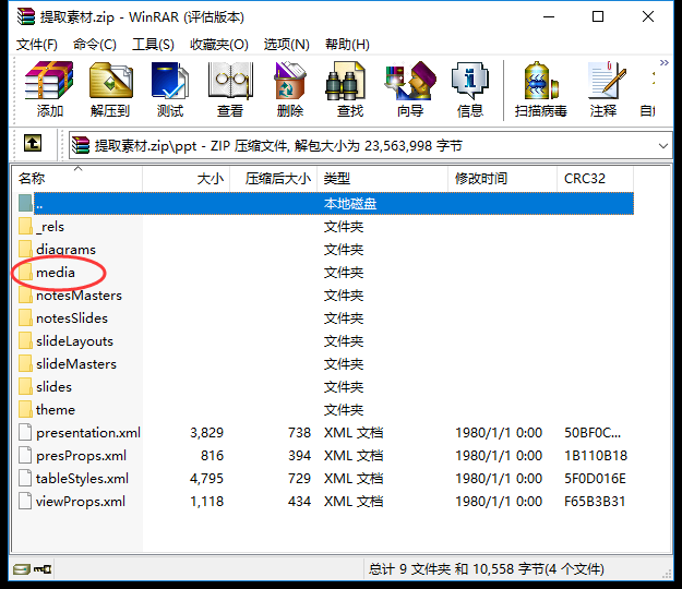 5、双击之,就可以打开这个文件,哇,里边有好多文件,像不像看到了世外桃源?点击“ppt”这个目录,又是好多内容,别怕,继续点“media”这个目录,就会看到PPT里的各种素材了。