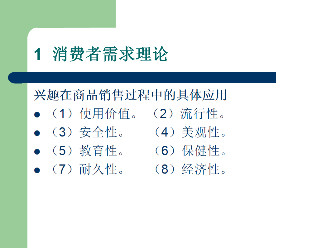 首先来说,对于美容顾客,消费是一个享受的过程,要想知道顾客需要什么,就要知道顾客对什么感兴趣,顾客消费理论中提到,兴趣在商品销售过程中的具体应用包括了:使用价值,流行性,安全性,美观性,教育性,保健性,耐久性,经济性。
