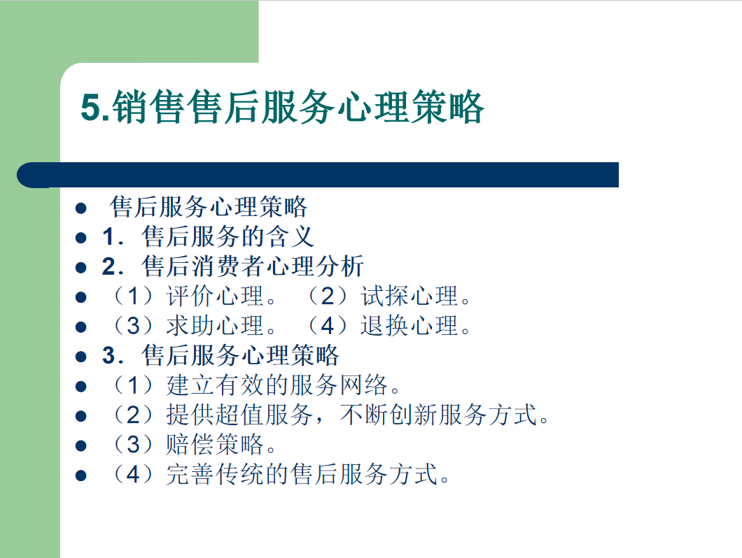 销售方面说了这么多,售后保证不了,其实结果很可能会前功尽弃,关于销售售后服务心理,要有相应的策略,要知道售后服务的含义,了解消费者心理分析,包括评价心理,试探心理,求助心理,退换心理。同时针对售后服务心理上的问题,要有相应的策略,比如:建立有效的服务网络,提供超值服务,不断创新服务方式,赔偿策略,完善传统的售后服务方式。