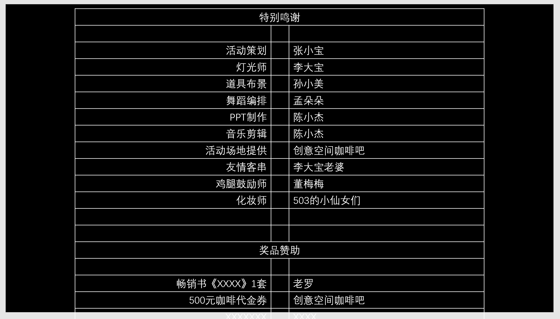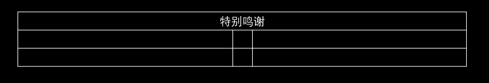 3、将表格设置为无底纹,在第一行输入「特别鸣谢」,设置水平、垂直居中对齐,文字颜色为白色,然后调节下方单元格宽度如图所示: