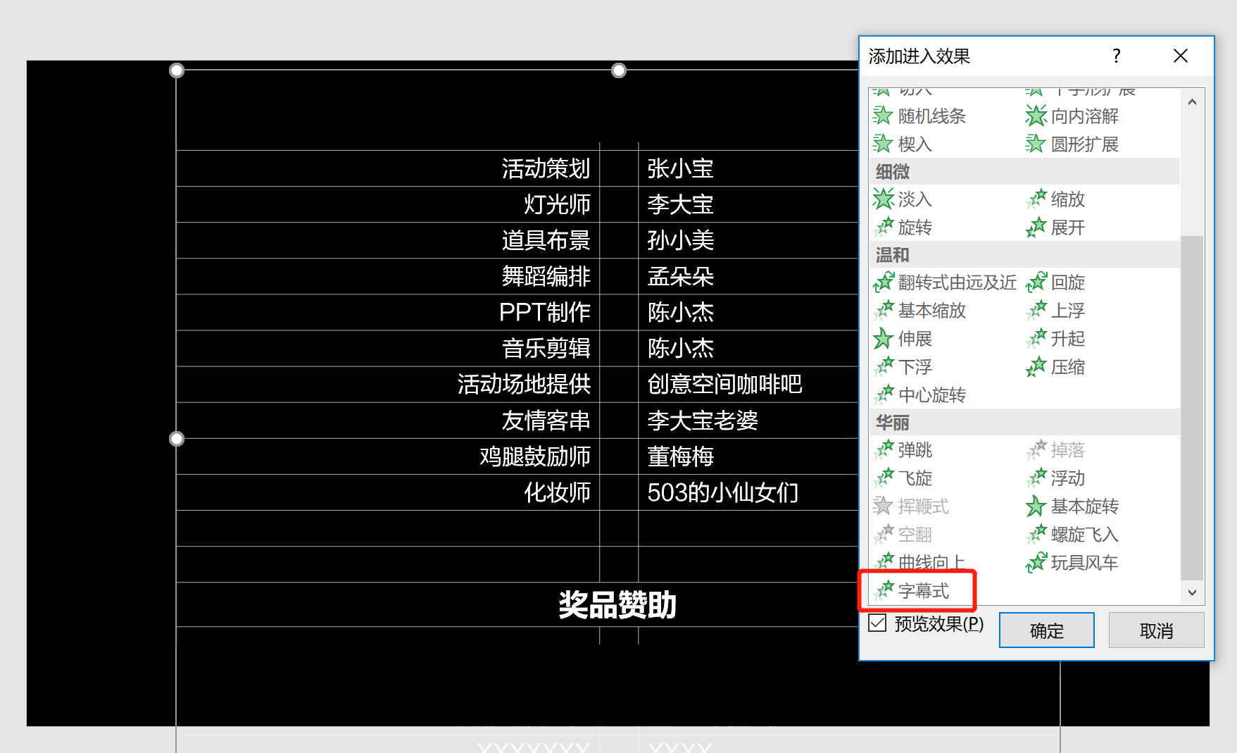 7、平面效果全部完成,动画非常简单。只需要选中表格,设置页面水平居中,然后为其添加进入动画中的「字幕式」的进入效果即可:
