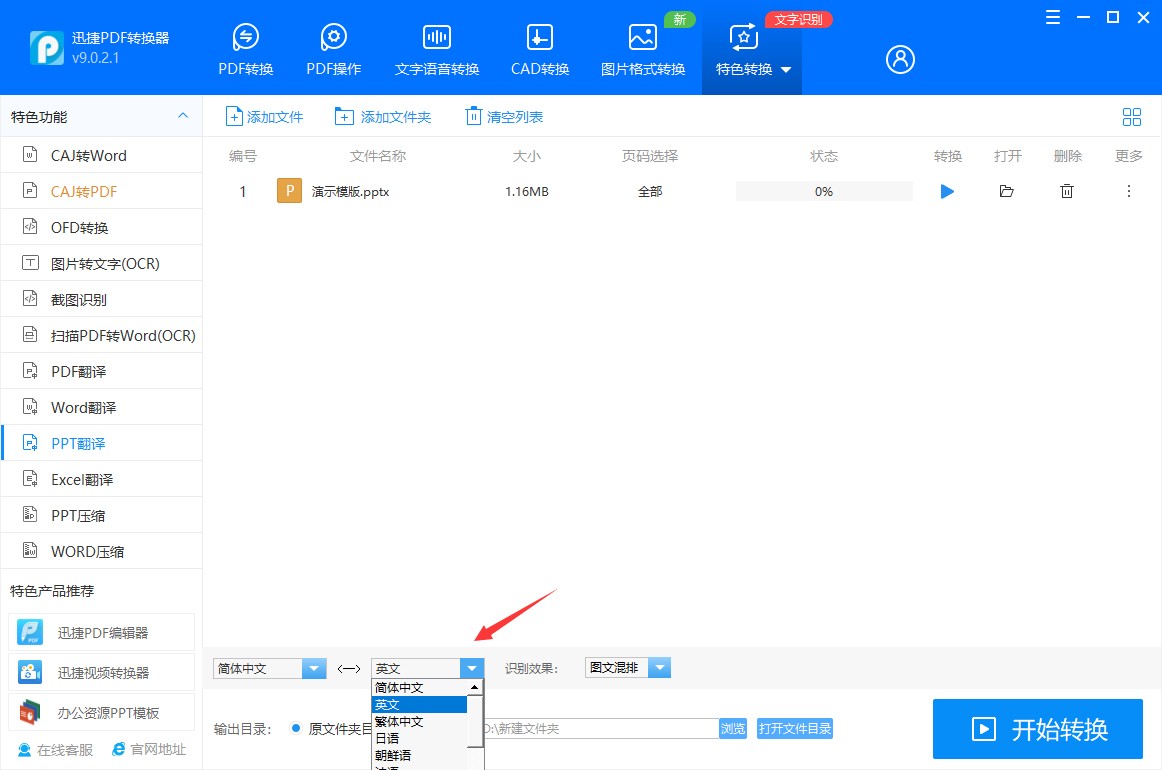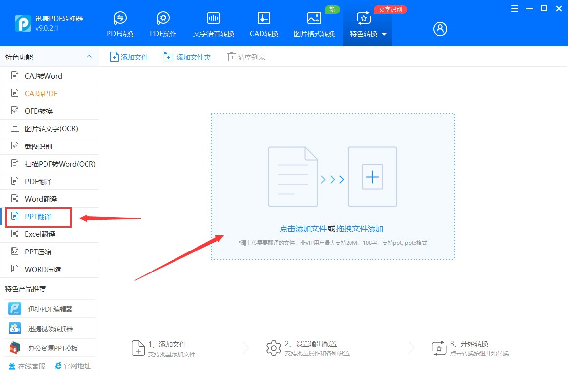打开操作界面,点击选择“特色转换”,点击左侧选择“PPT翻译”,并导入ppt文档;