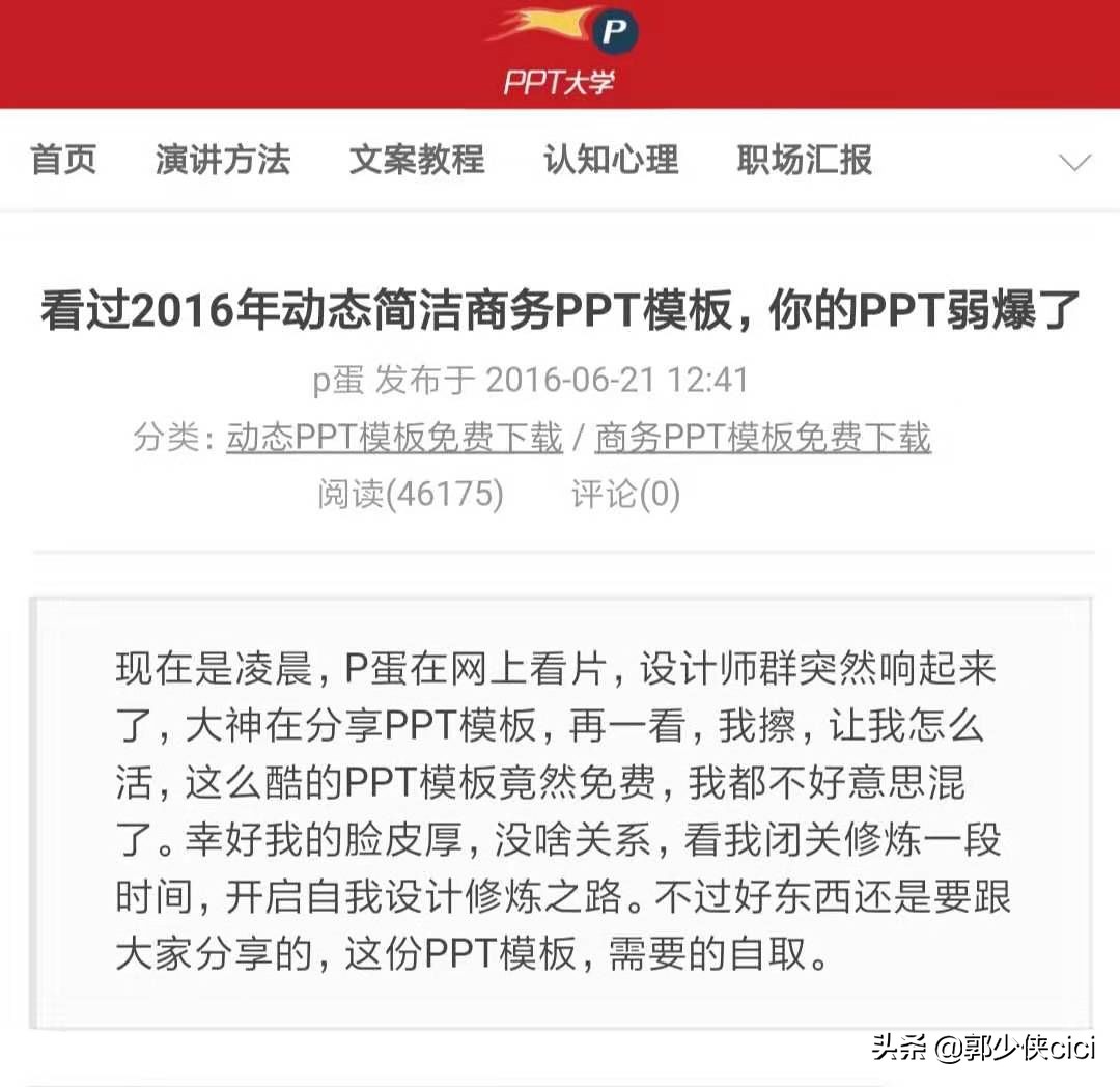 第一个是找一些公众号,里面会有PPT模板分享,但是往往这些公众号都需要转发分享或者打赏才能够领取,过程有点麻烦,而且领取的PPT模板是以压缩包的形式给你的,所以无法预览这些PPT模板到底好看不好看,到最后也不一定找到心水的模板。