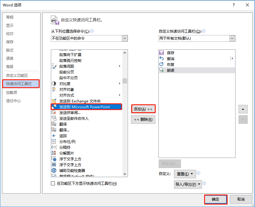 第一步:点击先要通过「文件」-「选项」-「快速访问工具栏」,然后呢在「不再功能区的命令」里面找到「发送到Microsoft PowerPoint」并添加,这样就可以把转换的图标先固定在页面的上方。