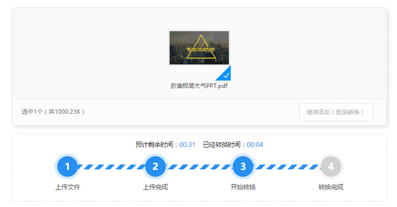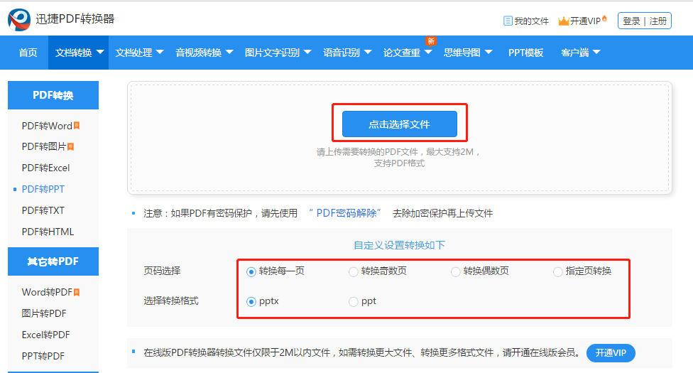 第二步:选择「点击选择文件」导入需要转换的PDF文件,可以自由选定特定的页面转换,也可以选择转换的PPT格式,设置完毕后点击「立即转换」。