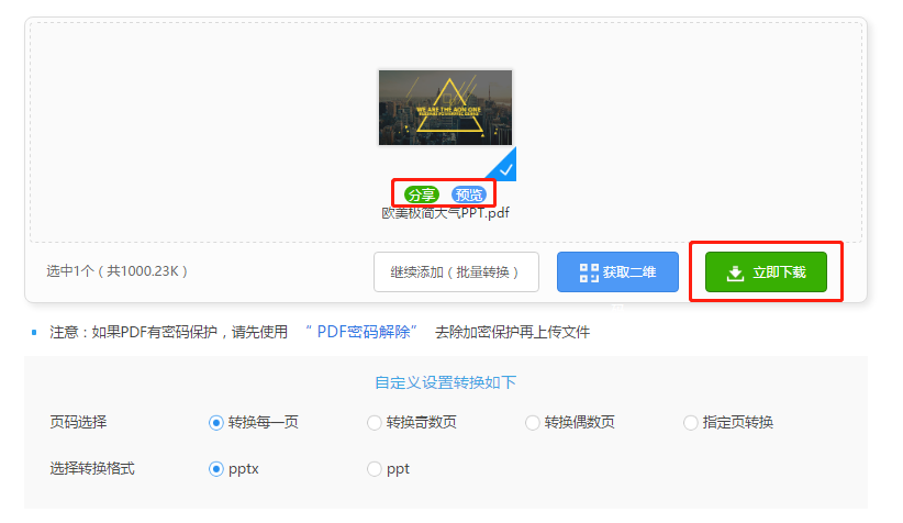 第三步:然后等待转换,转换成功之后,可以分享给朋友或者直接预览,然后点击「立即下载」就可以完美下载到你的电脑里啦~完全免费的哦!