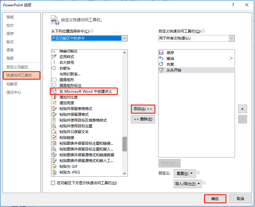 第一步:和前面一样,我们先要通过「快速访问工具栏」,把「在Microsoft Word中创建讲义」的图标添加,把图标先固定在页面的上方,便于接下来的操作。