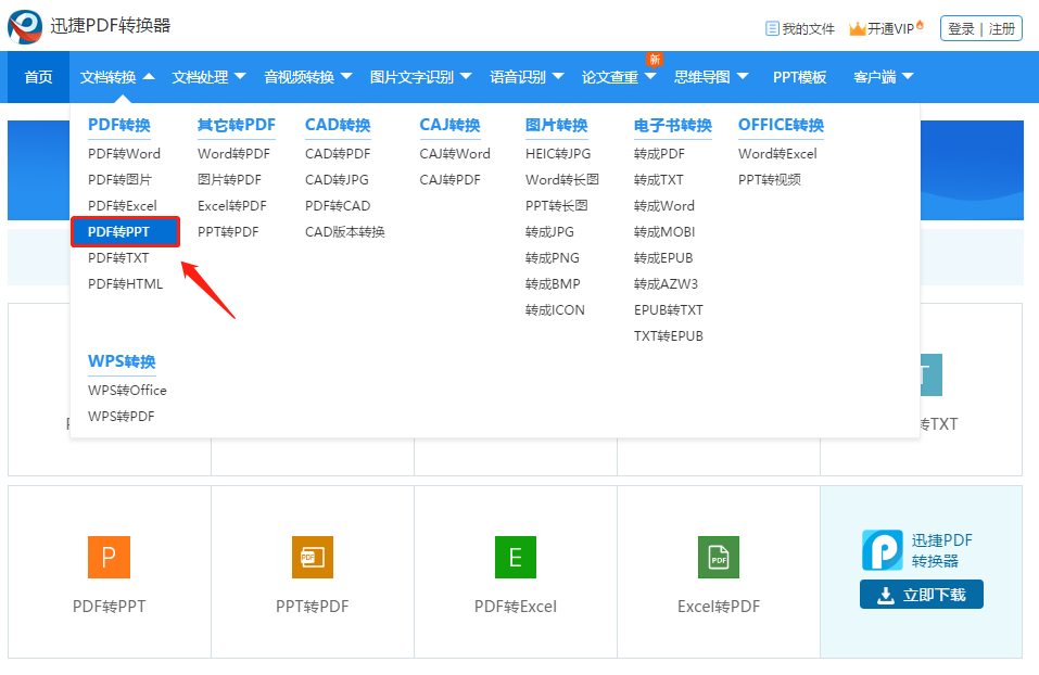 第一步:首先登陆迅捷PDF转换器在线版网站,这是一个专注于PDF与其他文件格式的网站,进入网站之后点击选「PDF转PPT」进入转换的界面。