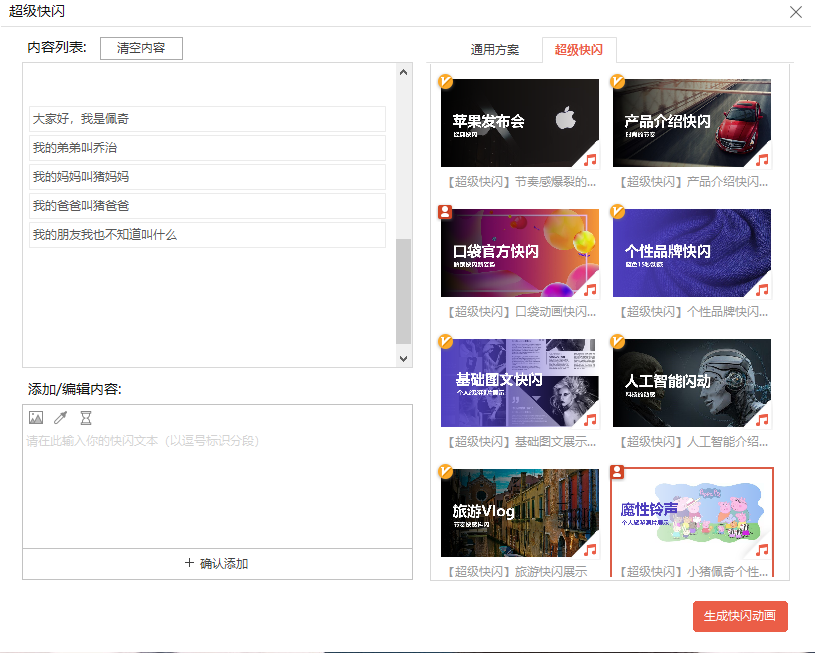 除了一键动画之外,它还有一个【超级快闪】,看这个功能的名字就知道它肯定有很炫酷的动画效果。制作超级快闪非常简单,输入你想要添加的内容,确认添加,然后选择快闪效果,点击【生成快闪动画】即可。