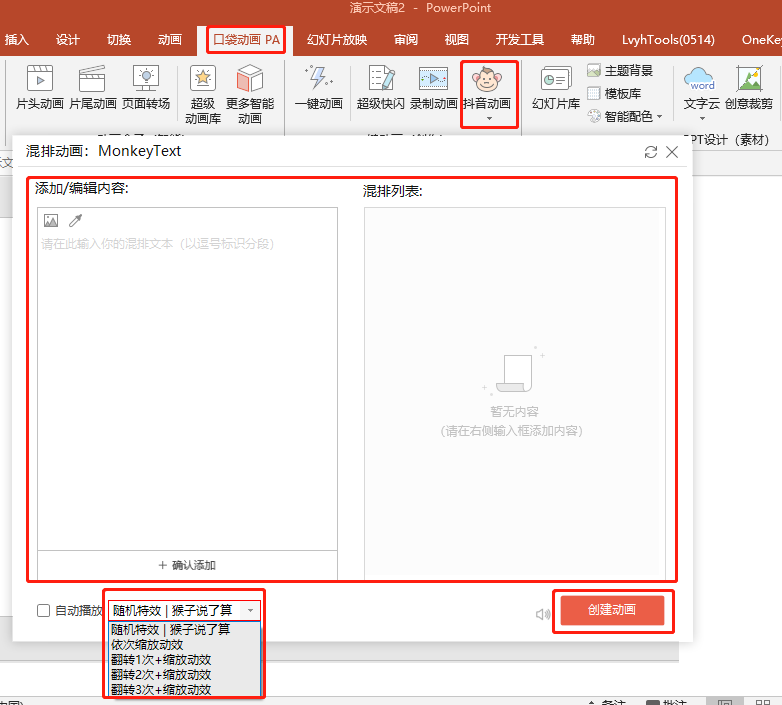 它还有一个是【抖音动画】功能,很多人都是在抖音注意到快闪PPT的,那些火遍抖音的快闪PPT可以用它一键生成,添加需要的内容,然后选择喜欢的特效,然后点击【创建动画】即可。