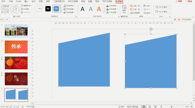 2.拖动角度调节的圆圈,使两个形状在PPT内平行且对齐。
