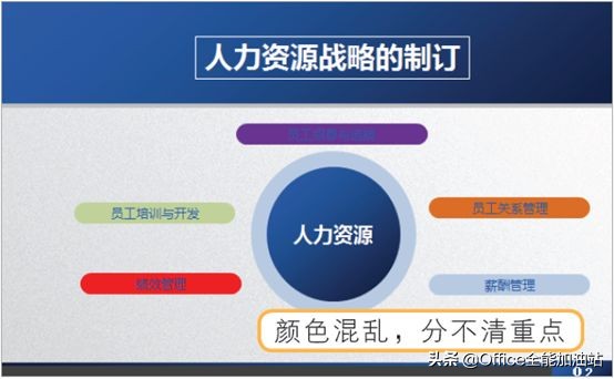场合配色法:配色并不是越绚丽越专业,那么怎样的配色才是正确无误的呢?首先要符合演讲场合的氛围,比如,在娱乐或非正式场合可以使用色彩缤纷的配色。