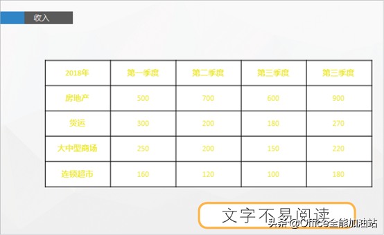 为了保障幻灯片的背景色不影响内容的识别,文字颜色与背景色之间需要存在一定的对比差异。如果背景色为白色,那么采用纯黑色的文字效果最佳,采用蓝色的文字效果也不错,千万不能采用黄色的文字。下图为选择不同颜色的文字后幻灯片呈现的对比效果。