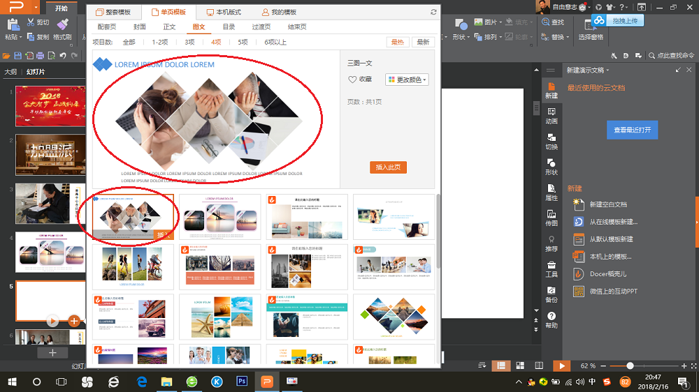 我相信还是有大部分人使用WPS的,那WPS里面就有很多自带的图文模板,直接套入再将图片进行修改就可以了!